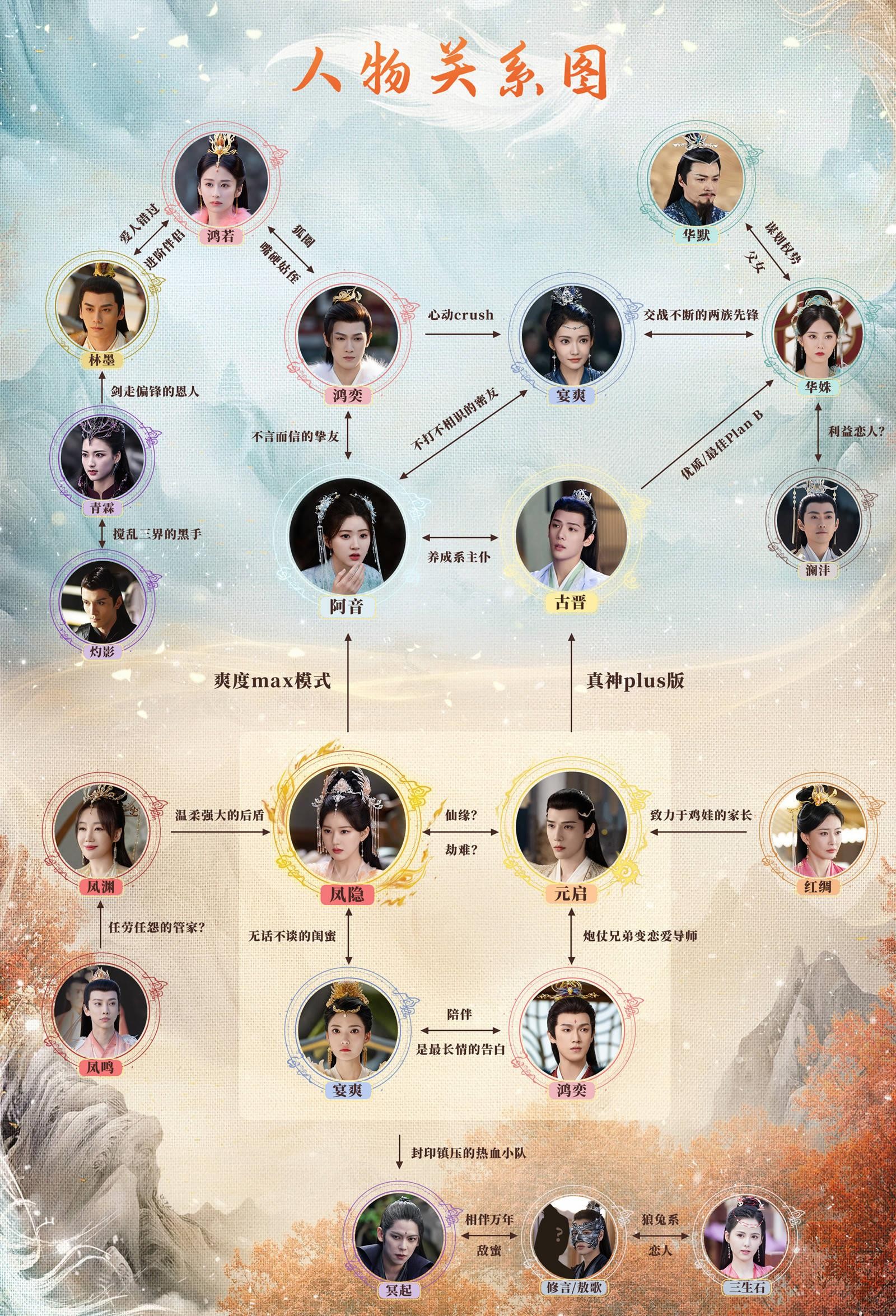 天帝鳳淵(ほうえん)の弟子であり、仙界梧桐島鳳族第二の火鳳。鳳隠(ほういん)は初降生の際に古晉の不注意により仙元を失い、そのうちの一つが水凝獣の體內に寄生した。古晉に孵化された後、仙僕として迎えられ、阿音(あいん)と名付けられ、鳳隠の仙元を探す旅に出た。旅の途中で二人は互いに惹かれ合うが、様々な誤解や行き違いから、阿音は古晉の元に神剣で魂を散らされてしまう。人間界で千年もの間転生を繰り返した後、鳳隠は転生して戻ってきた。