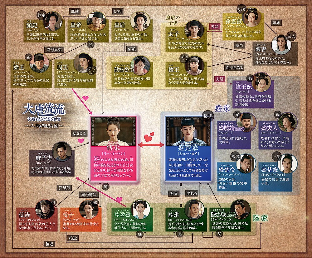 傅家の次女、商人の娘である傅柔(ふじゅう)は、蕙質蘭心(けいしつらんしん)、優しく善良な女性です。家伝の優れた刺繍の腕を持ち、家の刺繍工房と染物工房を管理しています。その卓越した刺繍の腕前によって皇后(こうごう)に宮中に召し出され、思いがけず女官となりました。物事を賢く処理し、弁舌もさわやかなことから、皇后に深く重用されています。