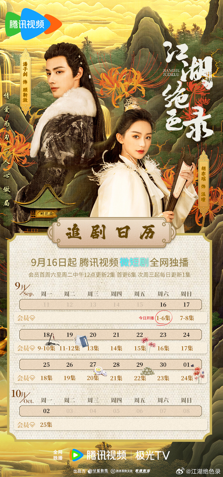 9月16日起,會員首周六至週二中午12點更新2集,首更6集,次週三起每日更新1集