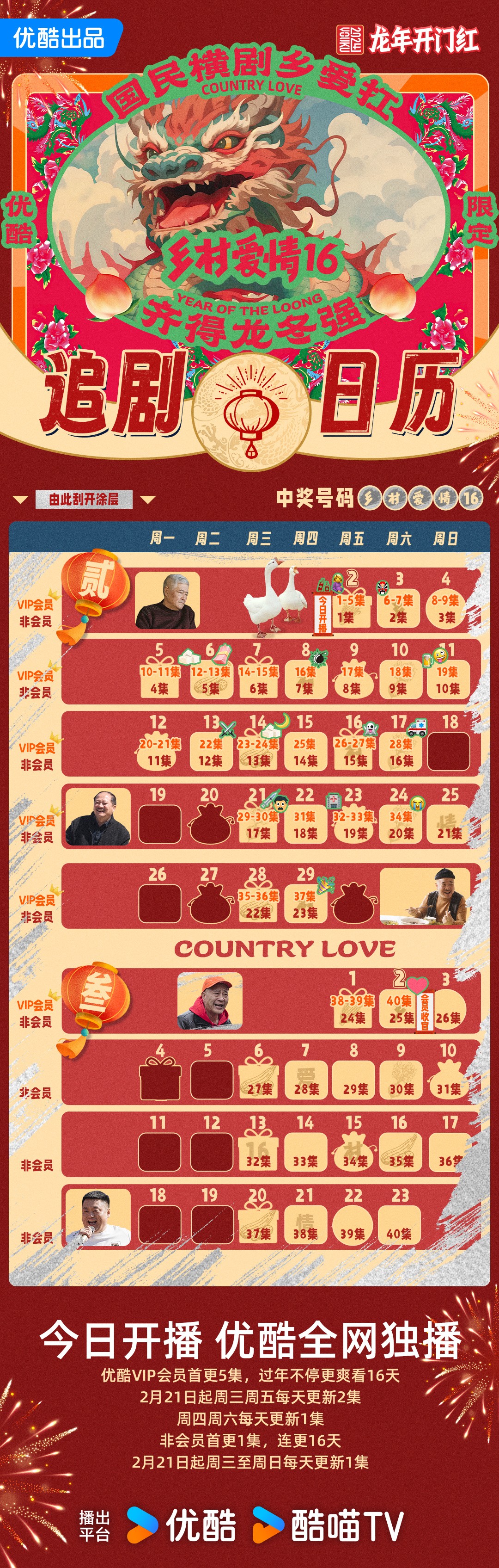 追劇日曆·2024年2月2日18:00開播,優酷全網獨播,優酷VIP會員首更5集(SVIP會員首更7集),過年不停更爽看16天,2月21日起週三周五每天更新2集,週四週六每天更新1集;非會員首更1集,連更16天,2月21日起週三至週日每天更新1集。會員更新日,SVIP會員提前再看2集