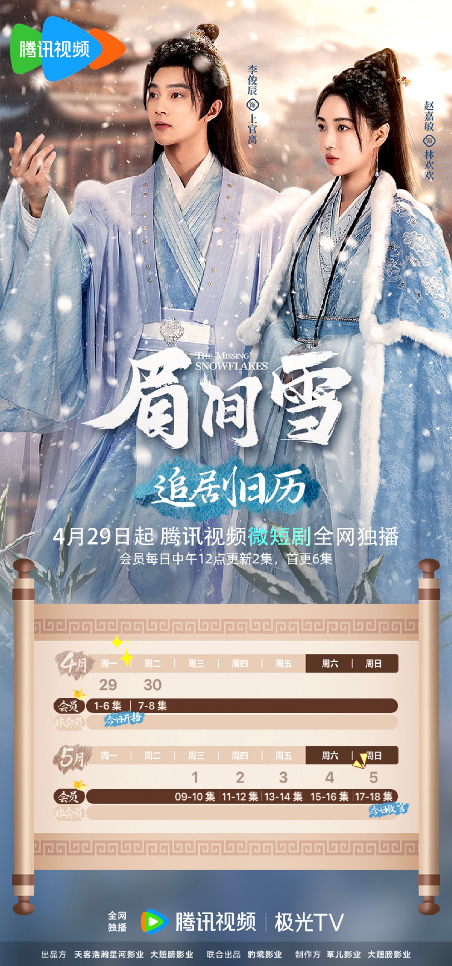 劇情介紹追劇日曆時間: 2024-04-29 05:514月29日起,騰訊視頻全網獨播。會員每日中午12點更新2集,首更6集更新時間/播出日期劇集2024-04-29周日1, 2, 3, 4, 5, 62024-04-30周一7, 82024-05-01周二9, 102024-05-02周三11, 122024-05-03周四13, 142024-05-04周五15, 162024-05-05周六17, 18(結局)陸劇古裝愛情