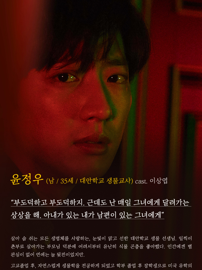 35歳、テアン學校の生物教師。3年前、妻はアメリカへ留學した。そんな中、スアの不倫現場を目撃し証言しようとしていたジウンが警察署前で倒れたのを助け、病院へ送り屆ける。その後、互いに既婚者であることを知り、深い関係にはならなかったものの、ジウンのことを気にかけるようになる。空港へ帰國した妻を迎えに行った際も、心からの喜びを感じることができないでいる。